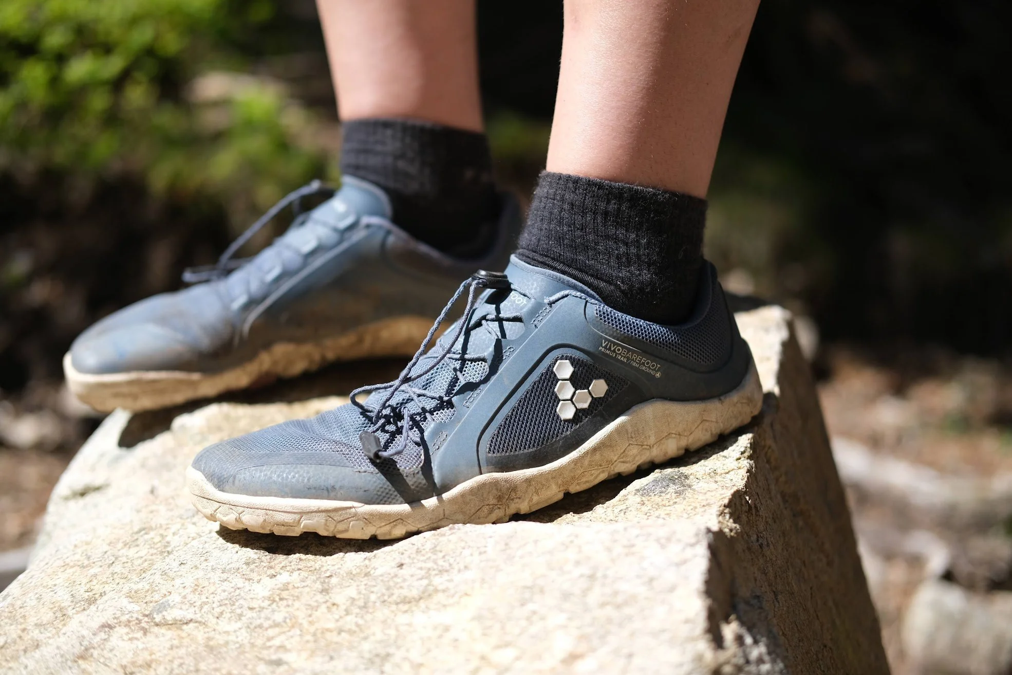 When it comes to footwear, we swear by wearing barefoot style shoes. After switching to barefoots in 2023, we have have not looked back. Our go to hiking shoes are the Vivobarefoot Primus shoes, these lightweight trail running shoes are quick-drying with great grip. They handle well in all sorts of terrain and give us a lot of confidence on the trail.